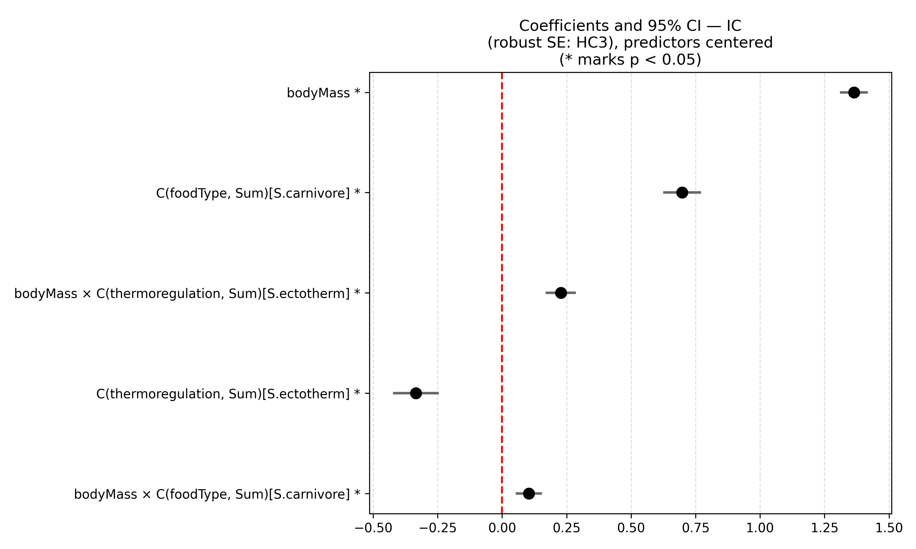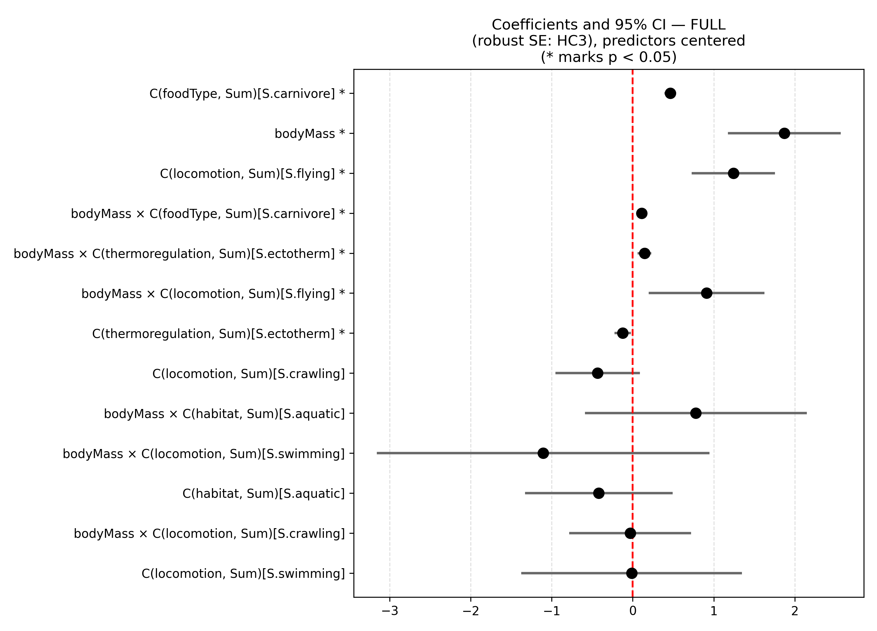 In summary, the ANCOVA model for the selected specification (after applying the VIF criterion) identified body mass as the strongest predictor of home-range size, with a positive and highly significant effect across all taxonomic and ecological groups considered. Two categorical factors, thermoregulatory strategy and primary food type, showed significant main effects as well as significant interactions with body mass. This indicates that the relationship between body mass and space use is not uniform across groups.
