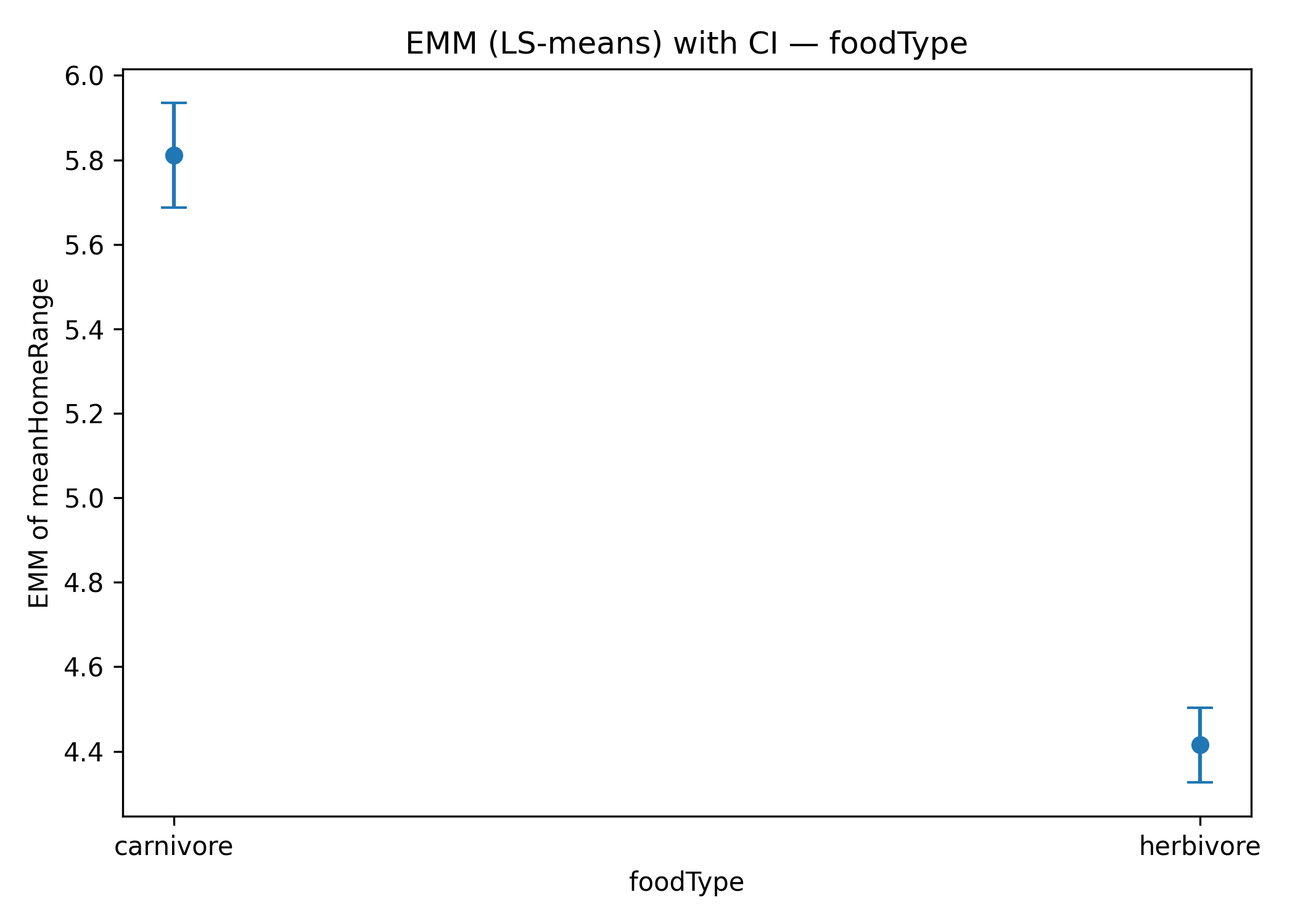 Figure 4: Estimated marginal means (EMMs) for categorical predictors: a) foodType: carnivores vs herbivores; b) thermoregulation: ectotherms vs endotherm.