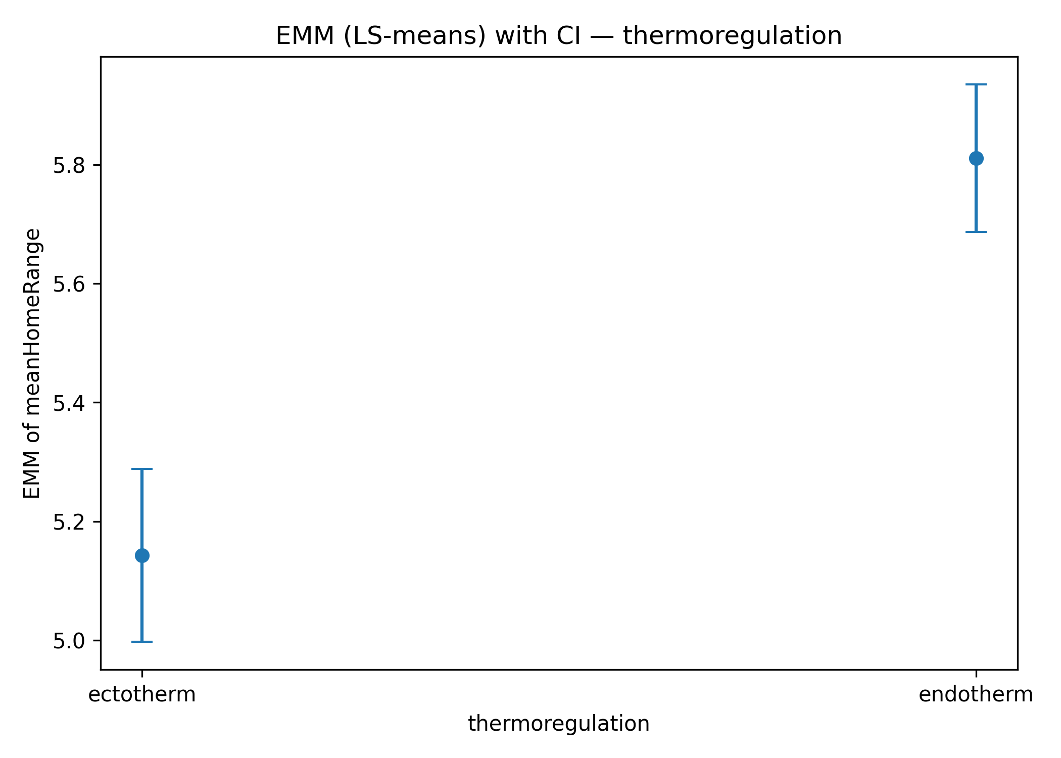 As shown in Figure 3b ectotherms exhibit a steeper relationship between home-range size and body mass compared to endotherms, suggesting that increases in body mass translate into proportionally greater spatial requirements in ectothermic species. Post-hoc analyses on the estimated marginal means (Holm correction) confirm significant differences between the two groups, particularly at intermediate and high body-mass values (Figure 4).
