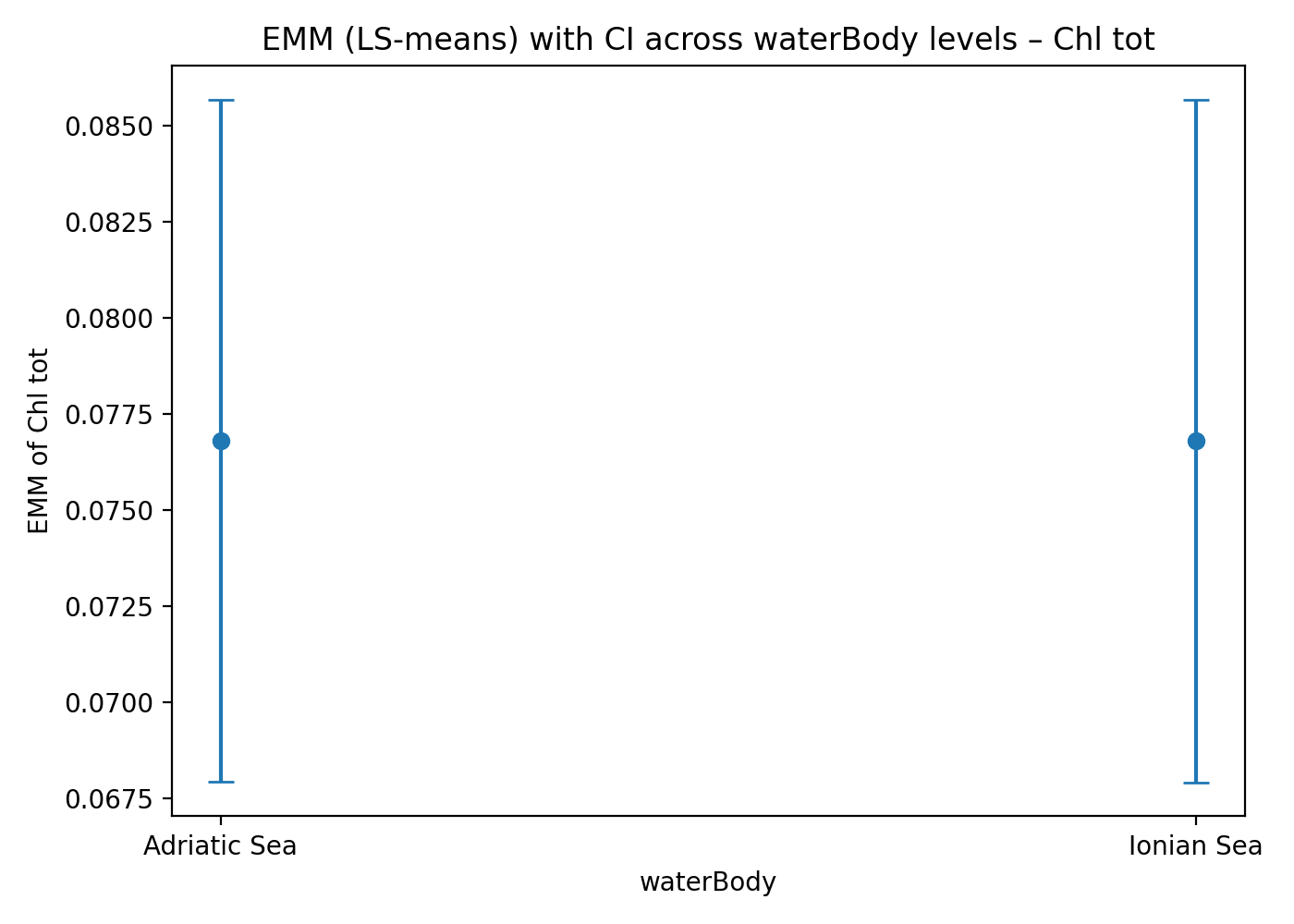 The estimated marginal means (EMMs) of Chl tot are very similar between the Adriatic and Ionian Seas, with substantial overlap of the 95% confidence intervals. This indicates the absence of a main effect of water body on Chl tot once environmental covariates are controlled for. (Figure 2). This does not imply that the two systems respond in the same way to environmental factors.