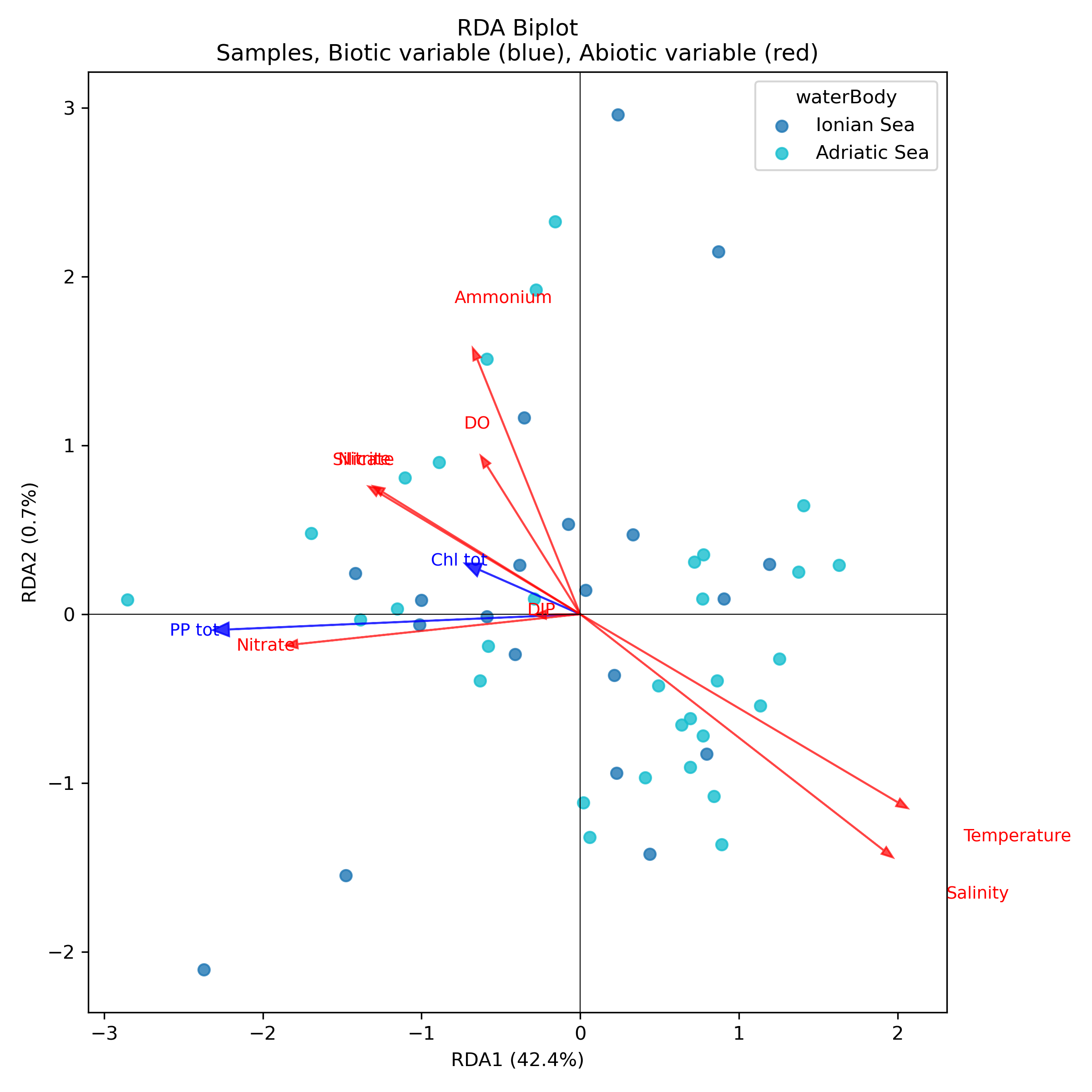 This case study aims to identify the main environmental drivers that control the functioning of the productive system within the study area and to assess how they influence system productivity, with a particular focus on the combined effects of abiotic factors on phytoplankton biomass (chlorophyll) and Primary Productivity (PP). Redundancy Analysis (RDA) was employed to quantify and visualise the relationships between biotic response variables and environmental covariates. Subsequently, univariate ANCOVA models were developed to determine the specific contributions of these drivers to each response variable and to test for potential interactions between factors and covariates. Overall, the objective of this study is to evaluate the relative influence of abiotic drivers on total primary production (PP and Chl) in the Adriatic and Ionian Seas, and to determine whether the relationships between key environmental factors and system productivity exhibit basin-specific patterns.