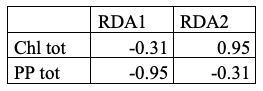 The biotic variables exhibit differentiated response patterns. Total primary production (PP_(tot)) is negatively oriented along RDA1, indicating a decline in biological productivity with increasing temperature and salinity (Table 1). Total chlorophyll (Chl_(tot)) shows a partial association with RDA2. However, as this axis only accounts for a very small fraction of the variance (<1%), this pattern should be interpreted with caution. This suggests that chlorophyll may be modulated by more local factors or residual variability not explained by the model, rather than responding strongly to the main environmental gradients.
